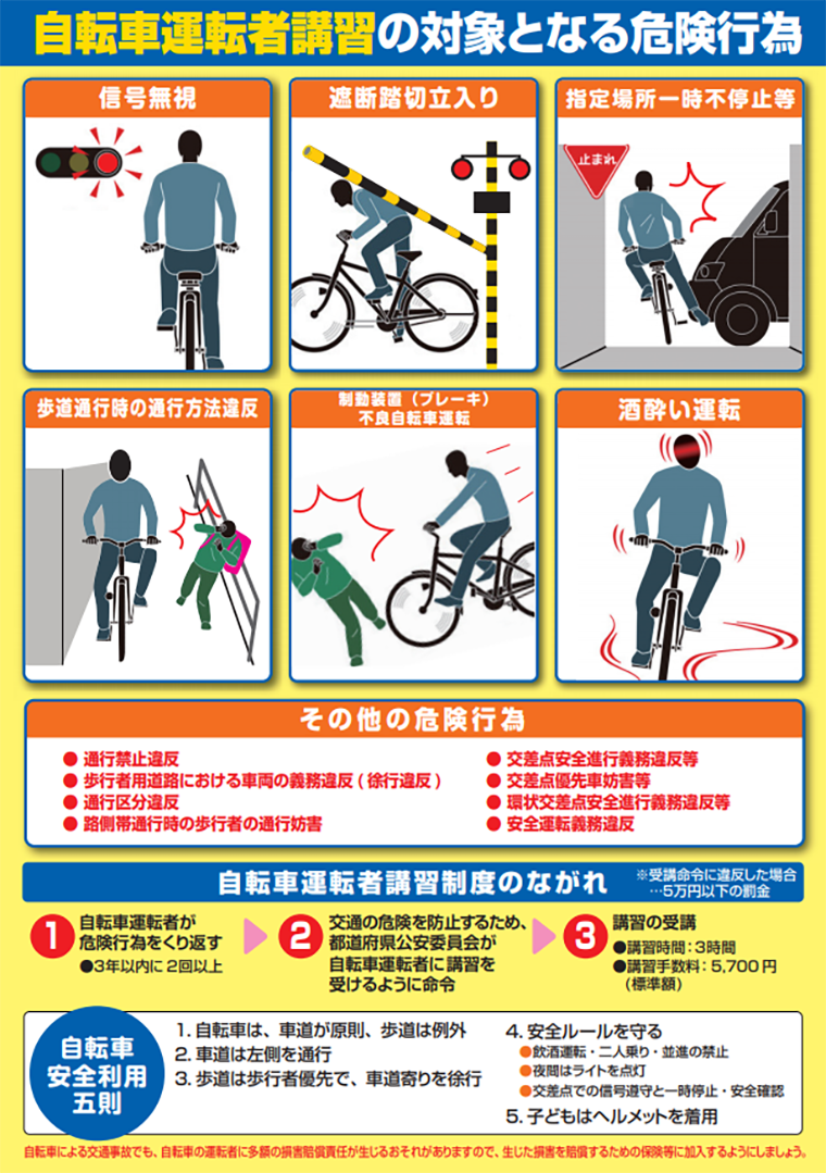 自転車の場合は「14歳以上の運転者」が以上の危険行為を繰り返し「3年以内に2回以上摘発された場合」に、公安委員会から受講命令書が交付され安全講習を受講することが義務付けられています。各自治体ごとに実施状況が異なりますが、東京都の場合、安全講習は約3時間、受講手数料は6,000円。自転車の運転ルールや危険行為に関する学習、交通ルールなどの理解度チェックなどが実施されます。
