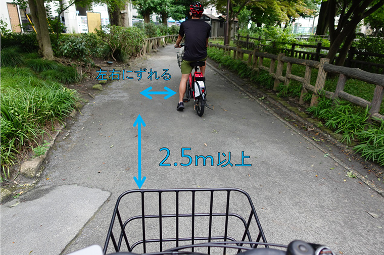 ②安全走行、ソーシャルディスタンスの観点からも、車間距離は十分にとりましょう。※自転車乗車時の車間距離についてはこちらの記事を参照。