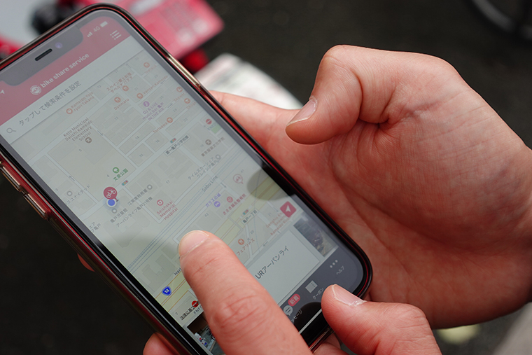 専用のアプリをダウンロードして名前等の個人情報や支払い方法などを入力する手間はありますが、入力後は簡単です。まずは乗り出したい付近のサイクルポートをアプリのマップで探し、そこに自転車があるかを確認します。
